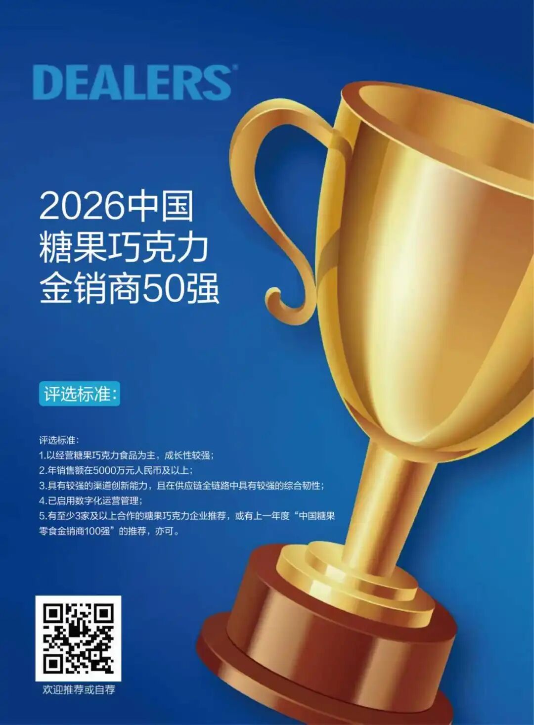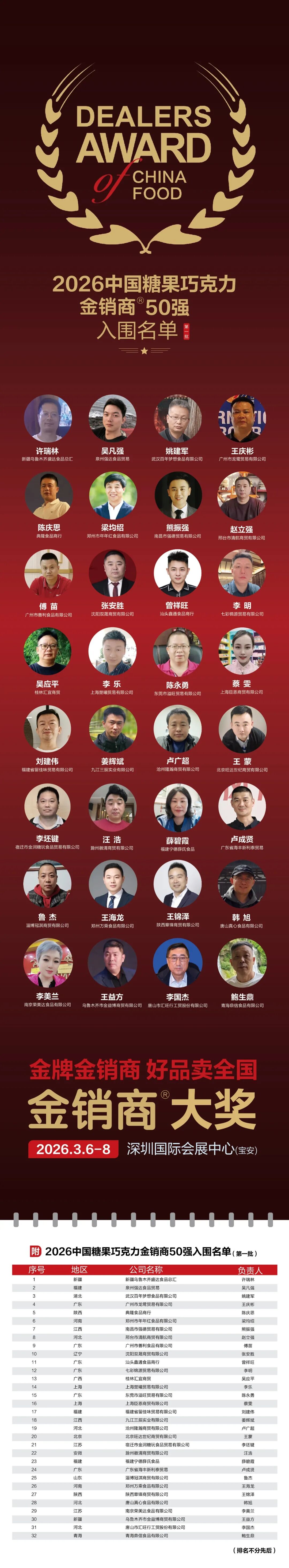 2026中国糖果巧克力金销商50强第一批入围名单,都有谁?发表时间:2026-02-03 11:35 糖果巧克力作为日常消费品中的重要类别,以其独特的愉悦体验位列五大享受型食品,在全球零售格局中占据稳固地位。国内该市场亦充满活力,发展势头持续强劲。 任何行业的蓬勃发展,都倚赖于幕后力量的坚实支撑。糖果巧克力行业能取得今日成就,离不开众多经销商的砥砺前行与辛勤耕耘。 他们是中国市场中不可或缺的传统渠道中坚,以无数个日夜的奋斗,携手铸就了行业的繁荣景象。 在此,《中国糖果》谨向所有奋斗在一线的糖果巧克力经销商,致以最深切的感谢与崇高的敬意! 第26届全球高端食品展览会(全食展)将于2026年3月6-8日在深圳国际会展中心(宝安)隆重举行。届时,将发布“2026中国糖果巧克力金销商50强”入围名单。 《中国糖果》现将第一批入围经销商名单公布如下(排名不分先后)。 ![]() 若您对上述入围名单有任何异议烦请联系主办方。 联系人:侯华威 联系电话:19910721387 邮箱:houhuawei@iallfood.com 具体评选标准如下,欢迎自荐或推荐!(扫描下方二维码即可报名) ![]() |