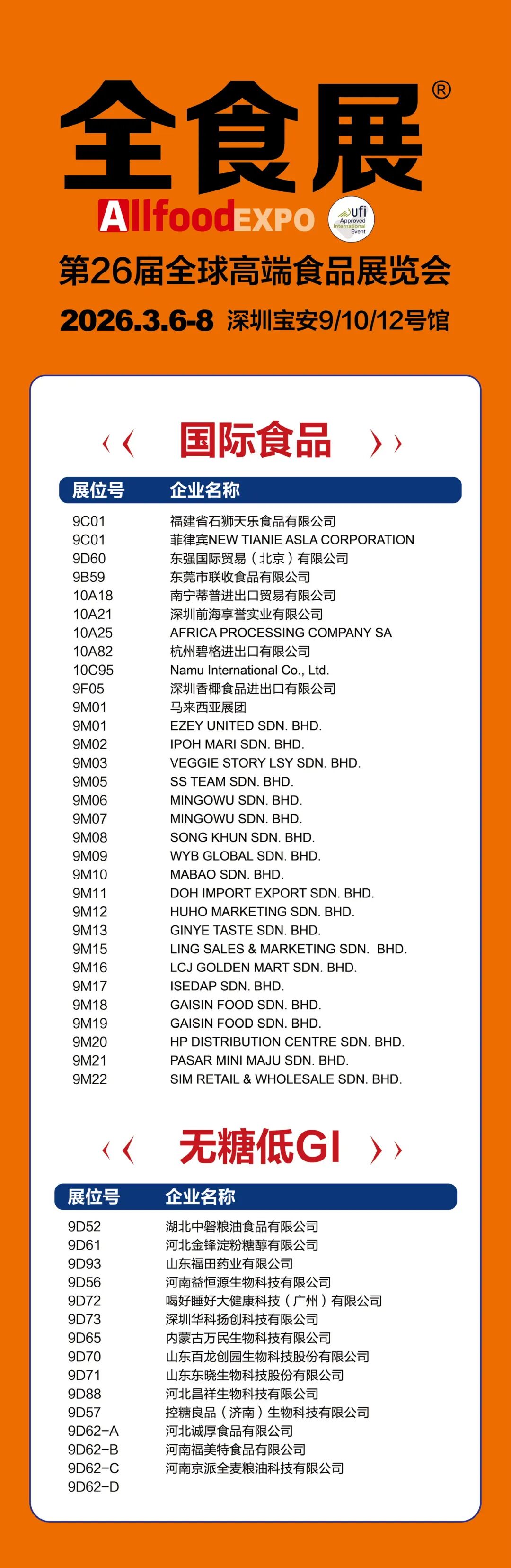 首创无糖低GI食品专业展区!深圳第26届全食展首批展商名录发布发表时间:2026-03-03 10:37 2026年食品饮料行业开年核心盛会—第26届全球高端食品展览会(全食展),将于3月6日-8日在深圳国际会展中心(宝安)正式启幕。 作为深耕行业多年的标杆展会,历经25届沉淀,早已成为食饮企业拓渠道、推新品、抓趋势的核心平台,也是全国经销商、渠道商超、电商达人开年选品的必到之地。 ![]() 本届展会依托粤港澳大湾区的核心商贸优势,以15万平方米超大规模,全面覆盖休闲零食、乳品饮料、健康功能食品、冰淇淋速冻食品、预制菜、食品包装机械等全产业链赛道,届时将汇聚全球30多个国家和地区的2800余家优质企业,带来2万余款年度新品,同期还将举办多场高规格行业高峰论坛,邀请行业大咖解码全年消费趋势,助力从业者精准把握2026年增长风口。 开年布局决定全年节奏,这场汇聚全产业链优质资源的行业盛宴,早已引发全行业的广泛关注。 为方便广大专业观众提前锁定意向品牌、高效规划观展行程,第26届深圳全食展第一批参展商名录正式公布: ![]() ![]() ![]() ![]() ![]() ![]() ![]() ![]() 更多优质展商信息将陆续揭晓,3月深圳,邀您共赴行业盛会,抢占开年商机。 |